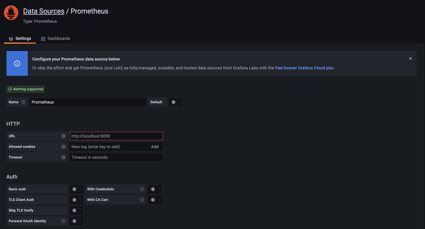 HTTP URL 입력 부분에 http://localhost:9090 혹은 Prometheus를 실행 중인 IP를 써준다.
