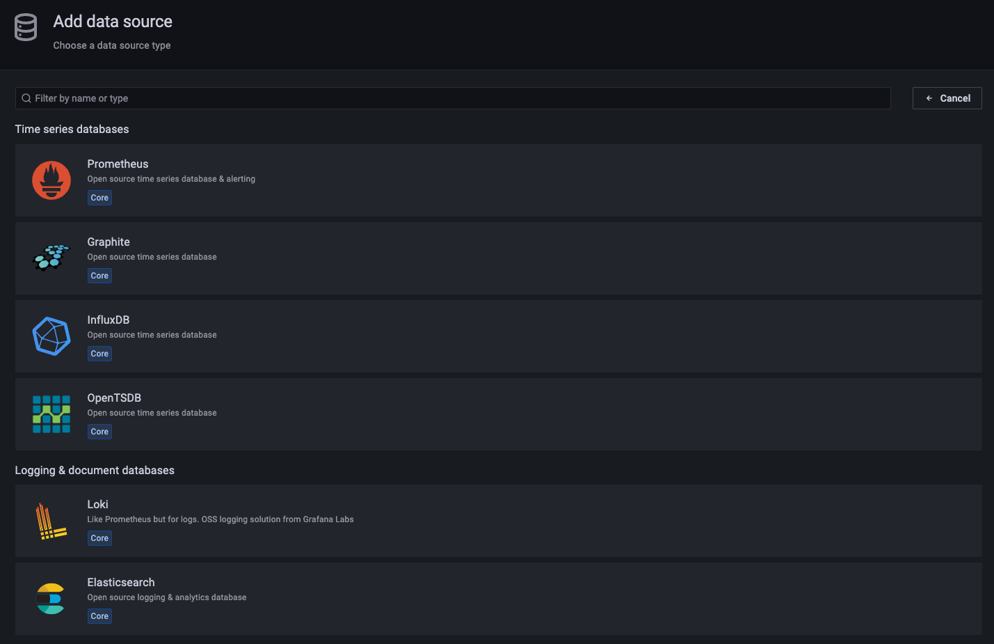 Add data source 버튼을 누르고 난 후에 다음과 같은 화면이 나오면 Prometheus를 선택한다.