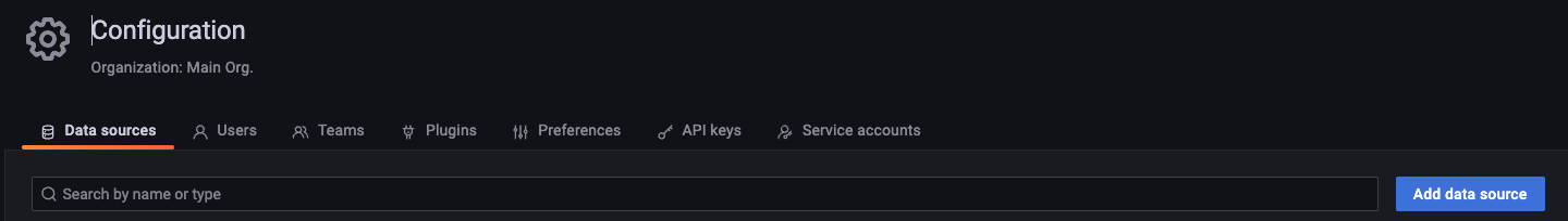 Configuration gear 아이콘을 누르고 우측 상단에 있는 Add data source 버튼을 누른다.